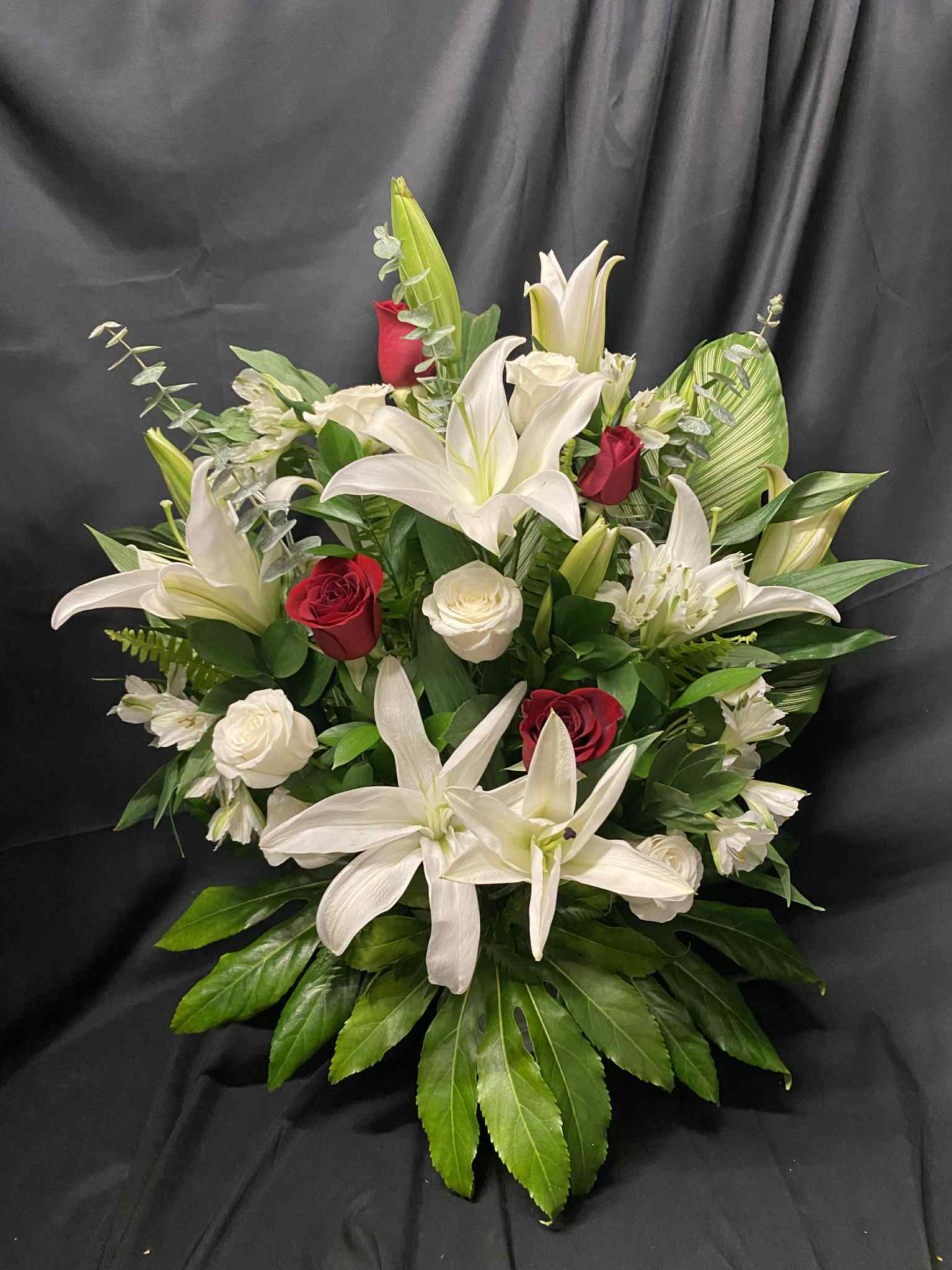 Lily & Love is a timeless expression of elegance and affection. Featuring graceful white lilies, five soft white roses, four rich red roses, delicate white alstroemeria, and lush greenery, this arrangement blends purity and passion in perfect harmony. Whether you're sending sympathy, celebrating a romantic milestone, or simply showing someone you care, Lily & Love offers a heartfelt gesture that speaks volumes without saying a word.