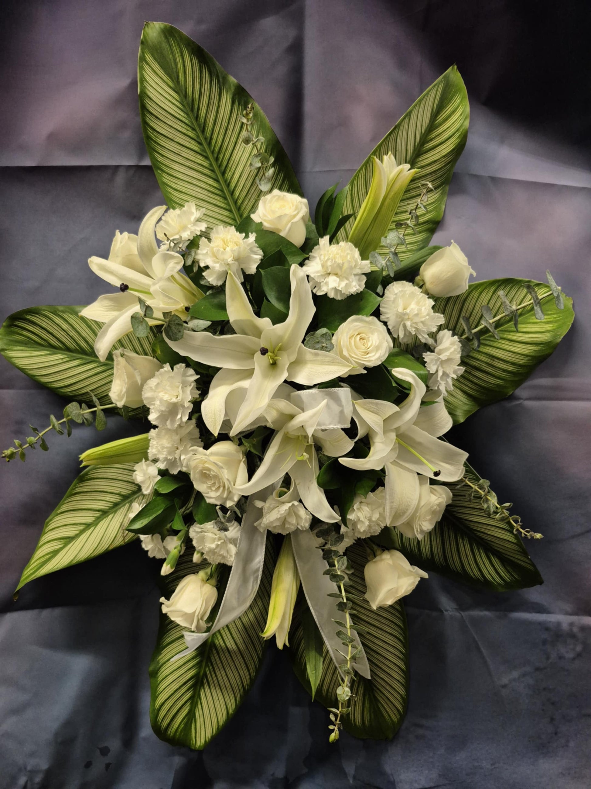 Peaceful Honor Standing Spray is a graceful tribute crafted with timeless elegance. Featuring serene white lilies, classic white roses, soft white carnations, and fragrant eucalyptus woven into lush greenery, this standing spray is topped with a pure white bow for a final touch of reverence. Peaceful Honor offers a beautiful expression of sympathy, conveying love, respect, and eternal peace in every bloom.