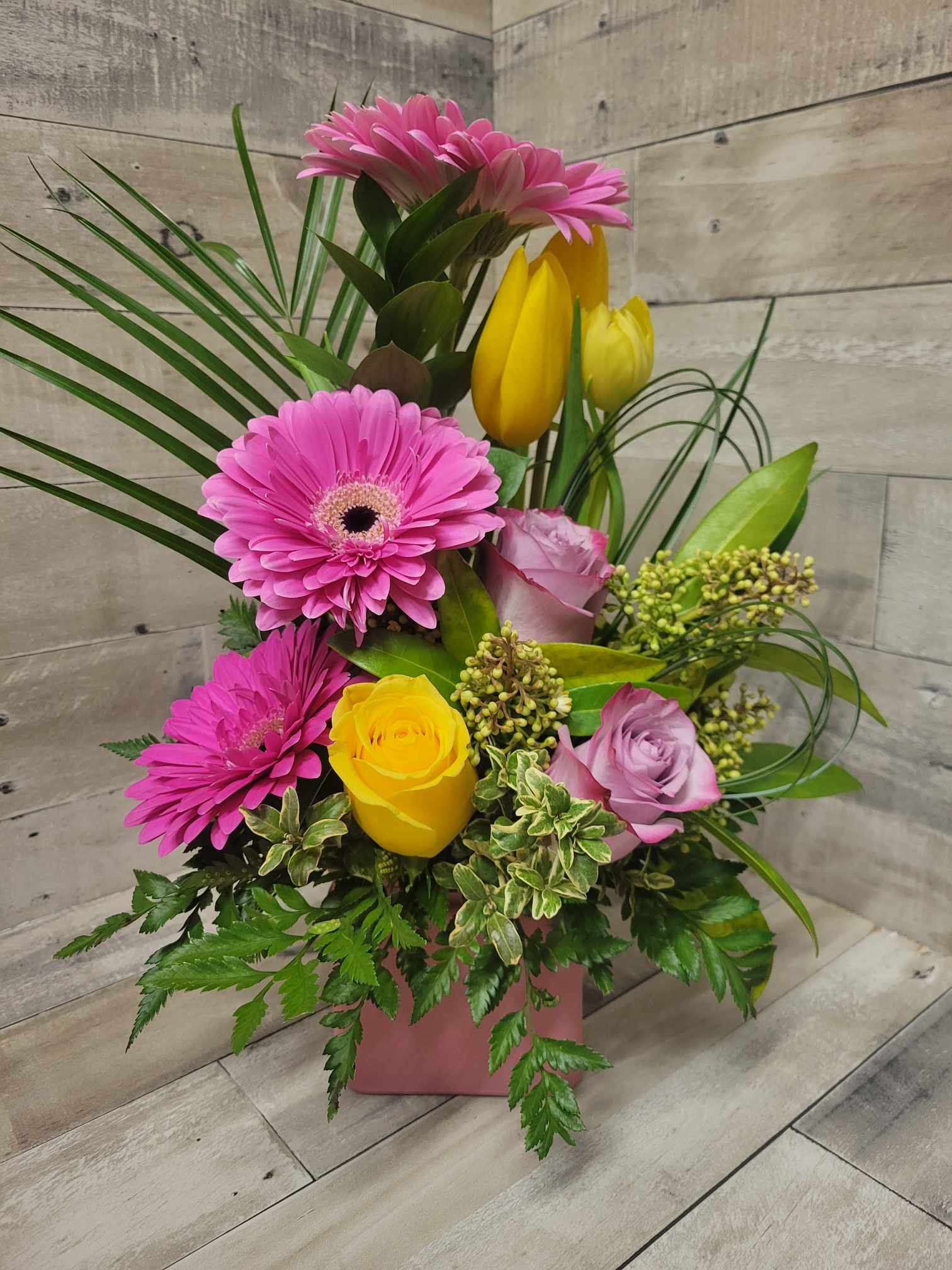 Delight in the joyful harmony of Spring Melody – a vibrant bouquet that sings with the colors of the season. Featuring cheerful pink gerberas, rich purple roses, sunny yellow tulips, and a classic yellow rose, all nestled in fresh greenery, this arrangement captures the uplifting spirit of spring in every bloom. Spring Melody is perfect for celebrating new beginnings, sending heartfelt wishes, or simply brightening someone's day with a burst of floral happiness. Let its cheerful tones and elegant composition bring a refreshing note of beauty to any space. 🌷🎶💐