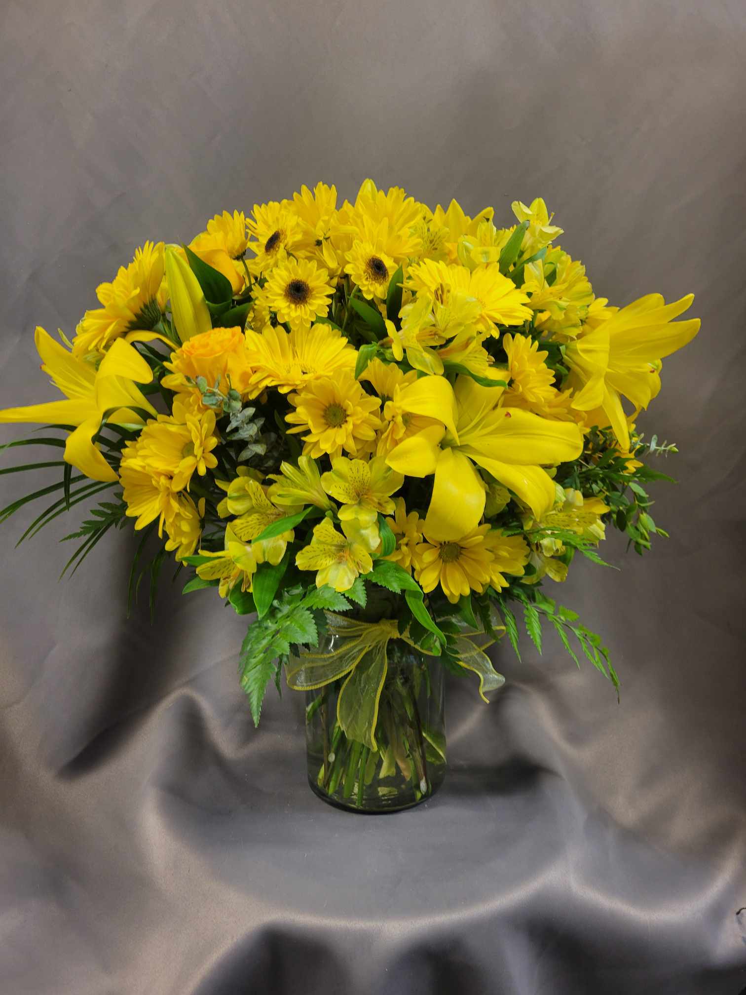 Brighten someone’s day with Sunny Serenade – a joyful symphony of golden blooms that radiates warmth and happiness. This vibrant arrangement features a cheerful medley of yellow lilies, daisies, alstroemerias, roses, poms, and button flowers, all beautifully arranged in a charming vase. Like a sunbeam in floral form, Sunny Serenade is perfect for celebrations, get-well wishes, or simply sending a little sunshine to someone you care about. Its uplifting energy and radiant color palette make it a stunning centerpiece and a heartfelt reminder that brighter days are always ahead.